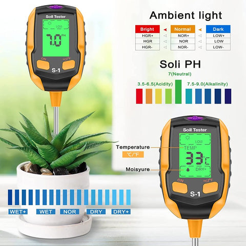 - MULTIFUNCTIONAL: This upgraded soil tester comes with a 4-in-1 function to measure the soil moisture, pH, temperature, and sunlight level of plants, which can help you take better care of flowers & plants.