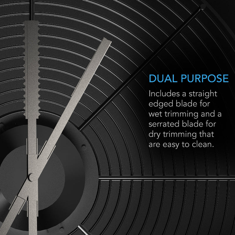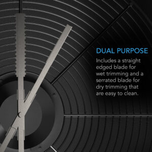 ✔ Dual Blades for Versatile Trimming – Includes a quadruple-edged straight blade for wet trimming and a serrated blade for dry trimming.