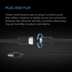 Speed ControllerAll models include a speed controller to optimize airflow and noise. The soft rotating knob provides ease of use and quick responses to changing conditions. | High-Performance MotorIt uses an AC motor that spins smoothly and is relatively silent. Capable of high airflow boosting in applications like active intake for grow tents. | Long-LastingFeatures a 67,000-hour lifespan, using balanced steel blades and lubricated ball bearings that eliminate the need to maintain the fan. | Tight and Secure LockThe aviation ports are easy to plug in and tightly secures each other using a retainer that also keeps moisture, dust, and debris out. |