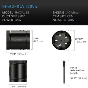 - Duct size: 8” | Dimensions: 7.28 x 7.87 x 7.87 in. | Airflow: 428 CFM | Noise: 43 dBA | Bearings: Dual Ball.