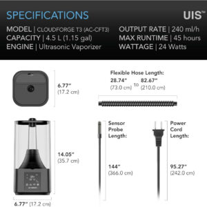 This series was designed from the ground up for optimized moisture control in growing space environments. The flexible tubing extends to over 4 feet long and supports targeted vapor distribution, making it possible to direct moisture to specific spots within your grow space. In addition to the specially designed seal, the body is built with waterproof ports that ensure no leakage when connecting UIS controllers. It also features a backlit display that can be toggled off to prevent night cycle disruption. It also has an automatic shutoff system that turns this humidifier off when its water supply is depleted.