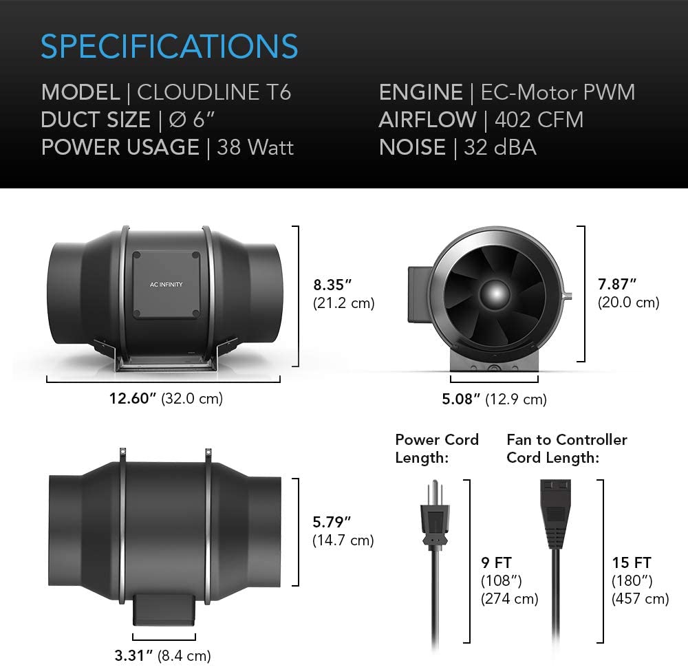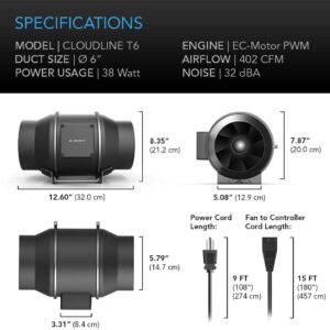 CLOUDLINE 4-SeriesA CLOUDLINE T4 plus CLOUDLINE S4 system can be linked to the same smart controller and used in conjunction for a total of 410 CFM airflow. This set-up is ideal for ventilating smaller grow tents and cooling AV rack cabinets. | CLOUDLINE 6-SeriesA CLOUDLINE T6 plus CLOUDLINE S6 system can be linked to the same smart controller and used in conjunction for a total of 804 CFM airflow. This set-up is ideal for large grow tents, AV closet cooling, and boosting airflow for HVAC projects. | MIX and MATCHThe same controller can connect CLOUDLINE fans of different sizes, to share the same programming. For example, an exhausting CLOUDLINE T6 with a filter can share the same controller as an intaking CLOUDLINE S4, to balance static pressure. |