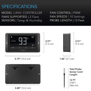 Smart ProgrammingT-series models include a programmable controller with precise temperature and humidity sensors located on the 12-foot corded probe. | Quiet PWM MotorEach system utilizes a DC or EC motor that is controlled using Pulse Width Modulation (PWM), which is quieter and more energy-efficient than AC fans. | Mixed-Flow DesignFeaturing a mixed flow design, the fans maintain peak performance in high static-pressure environments. Ingress-protected against dust and liquids. | Plug and PlayThe complete kit includes the inline fan unit, controller, user manual, and everything needed to mount the fan and power it through an outlet. |