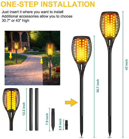 - EASY INSTALLATION: No wiring required, simply install the torch solar lights anywhere you like and enjoy the real and safe Flames! Comes with two poles, and the height is 43″ (please refer to the photo showing the size).