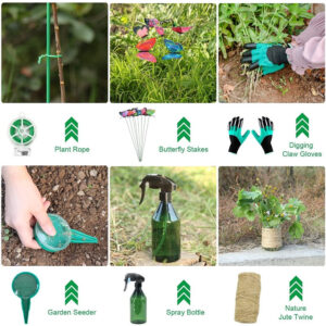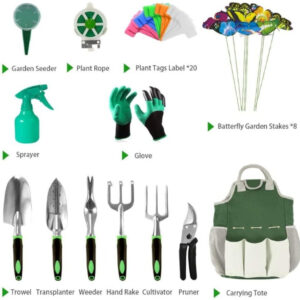 - COMPLETE GARDEN TOOLS SET: This Garden Toolset contains everything you need to raise the garden of your dreams: trowel, transplanter, hand rake, cultivator, weeder, pruner, sprayer, plant rope butterfly garden stakes, plant tags label, garden seeder, glove & tote organizer! There are a couple of different options available for this wonderful Garden Tools Set so please use the dropdown list to select the one that fits your Gardening needs.