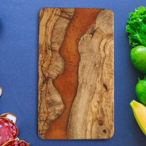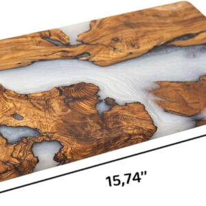 - BEAUTIFULLY DESIGNED AND DURABLE: This rustic live edge wood cutting board for the kitchen has its own uniquely stunning olive wood grain. Dimensions, colors, shapes, and wood grain patterns of natural resin cheese boards charcuterie boards may slightly vary due to the distinctive properties of each olive tree. The sturdy and practical wood cheese board can be used as a charcuterie kitchen accessory and also serves as a unique cutting board for kitchen décor.