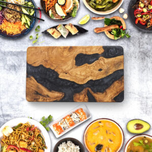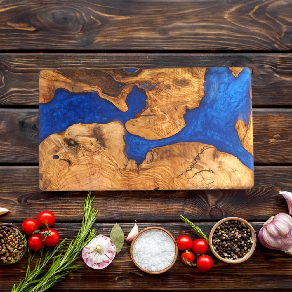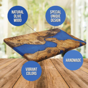 - VERSATILE AND ELEGANT: You may use both sides for serving cheese, fruit, and meat as an elegant and luxury olive wood charcuterie board or resin cutting board. The natural beauty of the olive grain makes these cheese charcuterie boards multifunctional for wine plates. Olive wood kitchen serving platter is gracious for serving, steak, pizza, fruits, sushi, bread, and other appetizers. Our handmade large wooden cutting boards for the kitchen make a heart-warming centerpiece on any dining table.